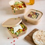 25oz square kraft food container. Thai food, fried chicken and more. This square food container is perfect for street food. Made from sustainably-sourced kraft board with a water-based lining. Brown kraft with green Vegware messaging. Award-winning quality by Vegware, made from plants. Designed for industrial composting, made from recyclable materials.