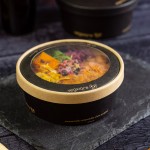 Black & Kraft paper lid with cellophane window for 150-Series food containers. Perfect for displaying your hot street food. Made from sustainably-sourced paper with a cellophane window. Award-winning quality by Vegware, made from plants. Designed for industrial composting.