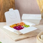 58oz Folia Container. Made with renewable resources. Made with moulded natural fibres like sugarcane and bamboo.Suitable for hot and cold foods. Microwaveable and freezable. Grease and cut resistant. BPI Certified compostable. No-added PFAS.